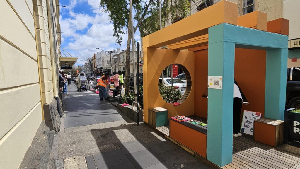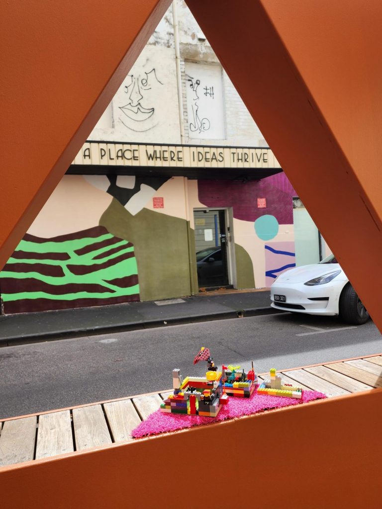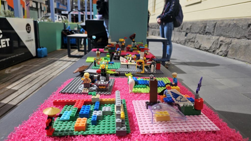 The future play lab were a part of the Greville St Library opening festivities – we hosted a Lego workshop inside, and playbusking outside in the parklet.