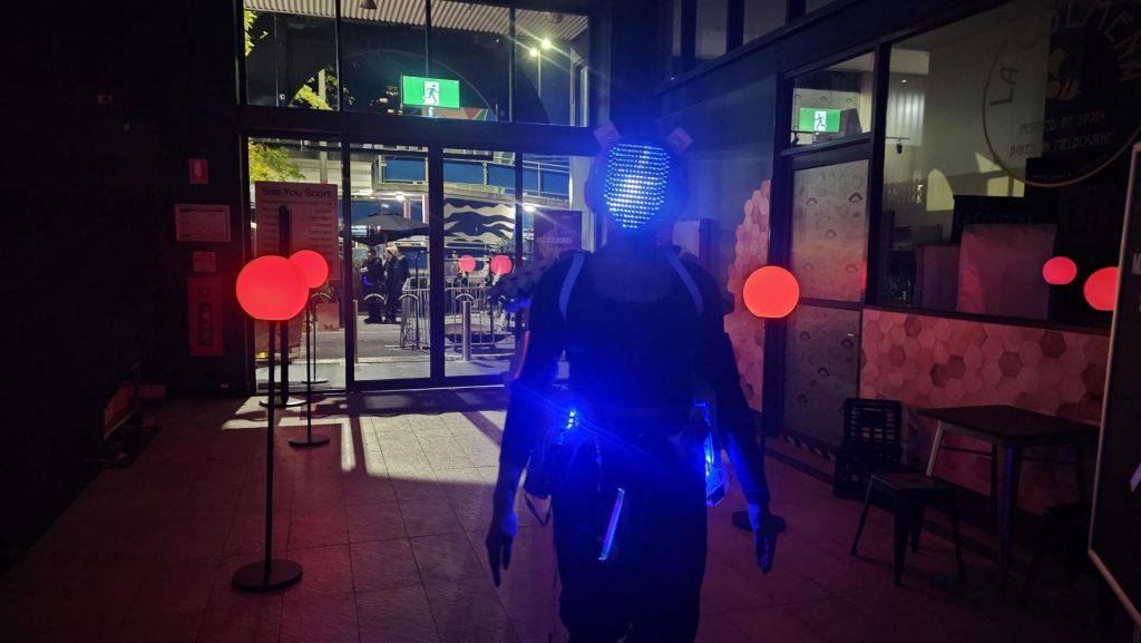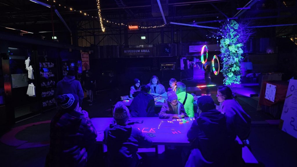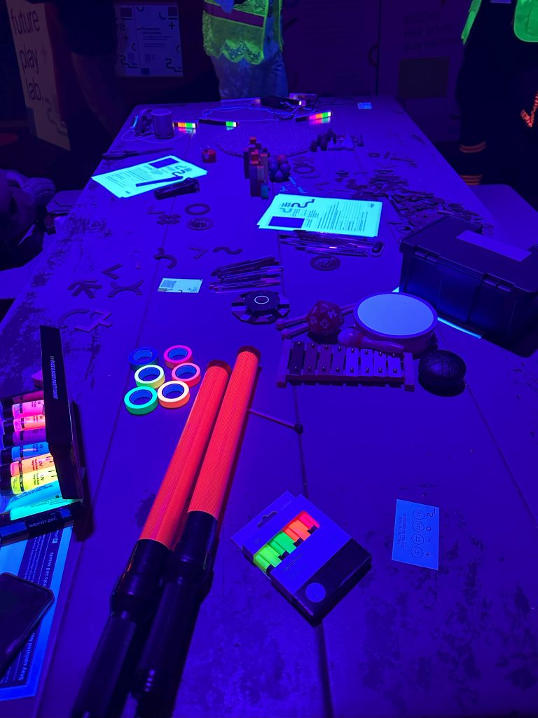 A small-scale LARP (live action role play) was played within the market. A character, Mr Lone Avocado, enlisted festival attendees into participating within the game – offering a drinks card if they successfully finished the game. He sent them to meet a roaming CityAI character (cosplaying as an android), within the interior of the market. The CityAI directed them to a creative placemaker, located by the luminescent garden. The creative placemaker finally led players to some tables, lit up by blacklight globes in the middle of the dark market, where players were invited to play with tabletop musical instruments, paints, tapes and highlighters – while answering broad questions around speculative futures, markets, place and self.
