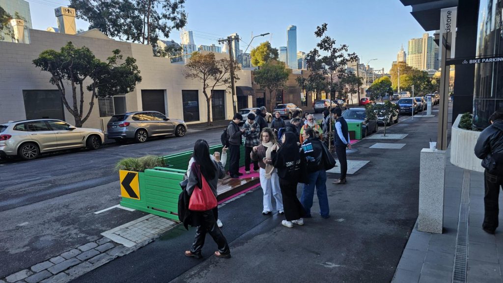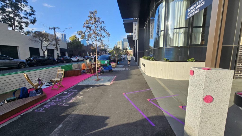 While Kirrip park was not a possibility for us, City of Port Phillip indicated that it would be interested in playful activations that could be implemented in the Montague precinct. Carlo approached a local apartment development across from Kirrip park, The Gladstone, to see if a parklet would be of interest outside their newly built residential towers. The community outreach and partnerships manager at the Gladstone, Demi, agreed to have the parklet.