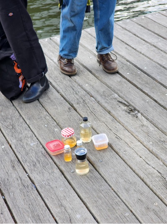 We met at 3pm at the first location, using bright pink astroturf shapes as a meeting place, a playful nod to the parklet branding at the Future Play Lab. Participants selected a recycled vessel from the collection I had brought along, before being invited to collect some water, most opting for doing so directly from the water’s edge.